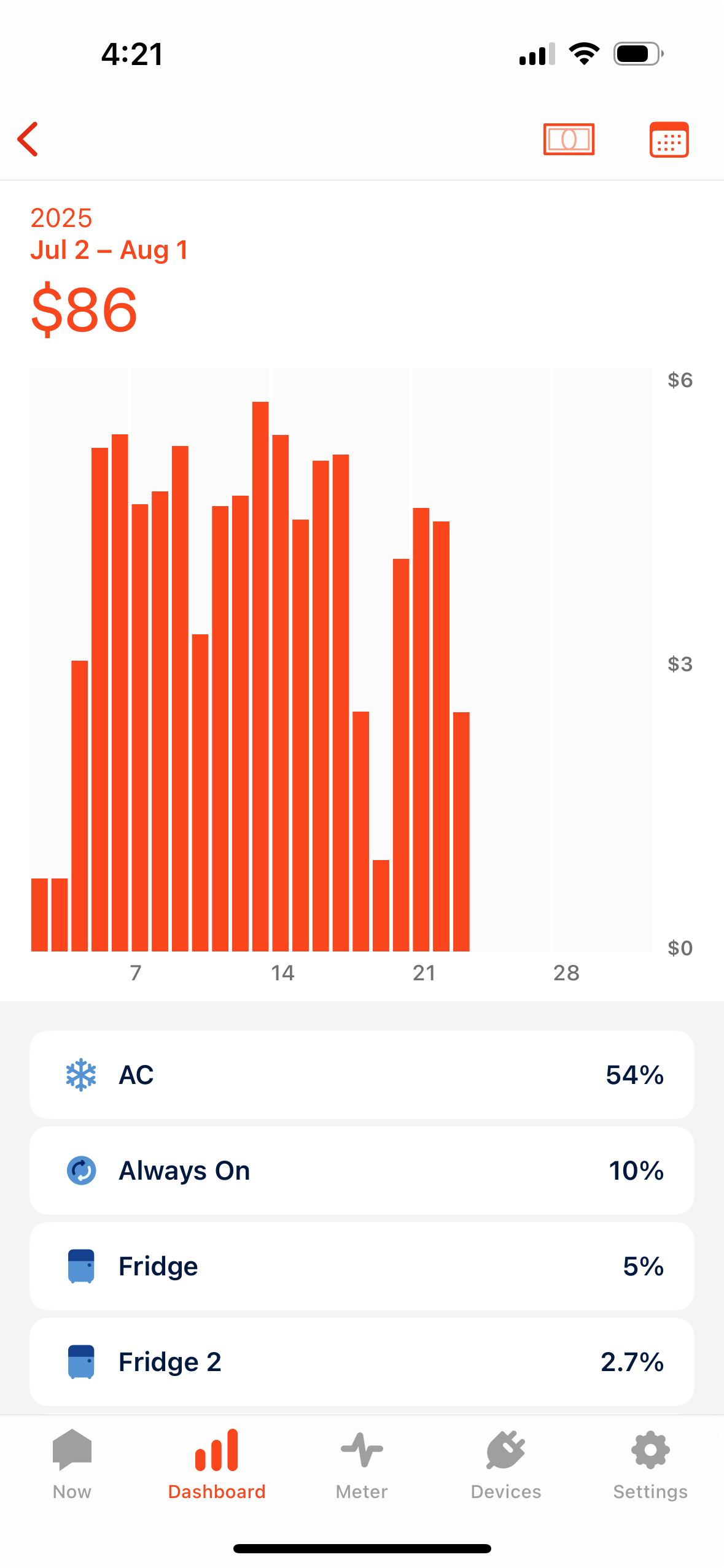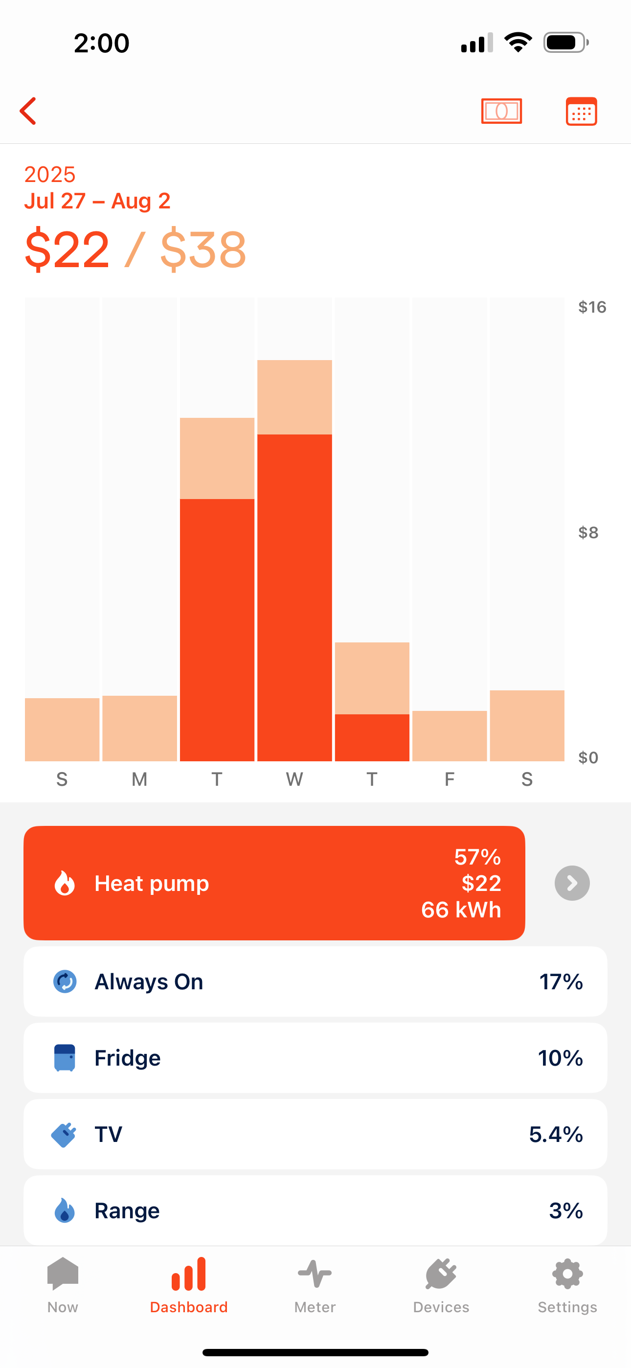 - The summary will show the total usage for that device out of total usage for the period shown, for example: $22 / $38