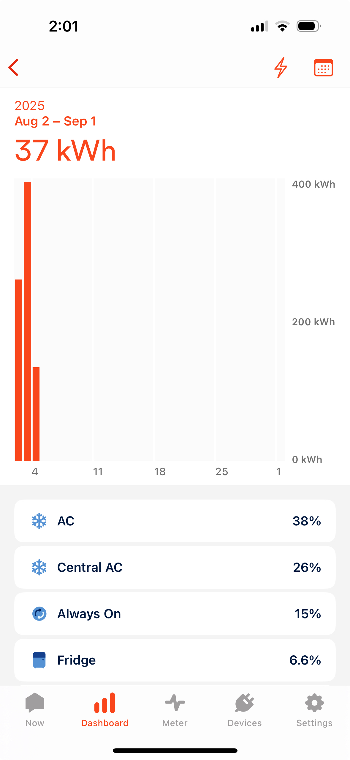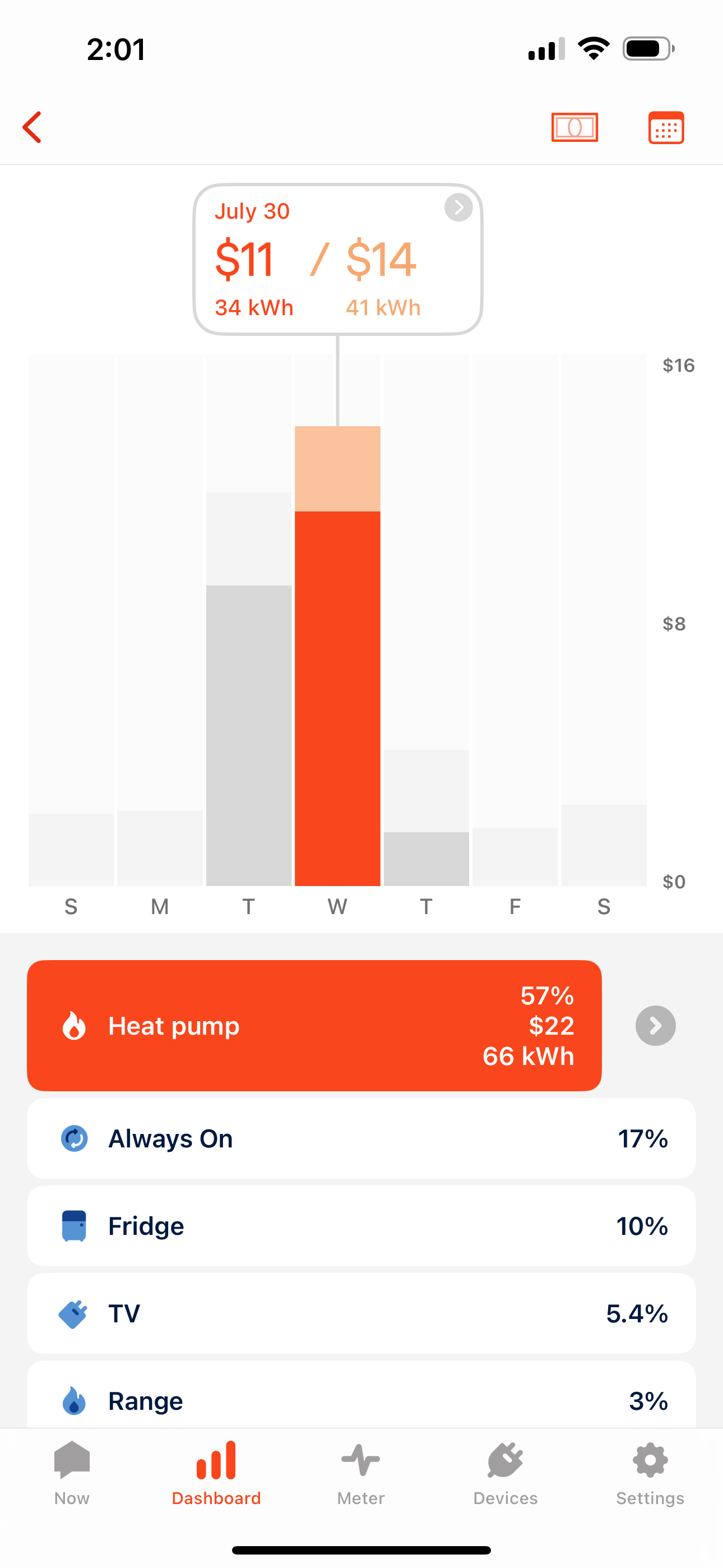 To change the unit your usage amounts are displayed in, tap the dollar bill icon or the kWh "bolt" icon (top right corner near the calendar icon) and select your preference. If you don't see an icon, check in Settings > Electricity Info to confirm that "Show Cost" is enabled.