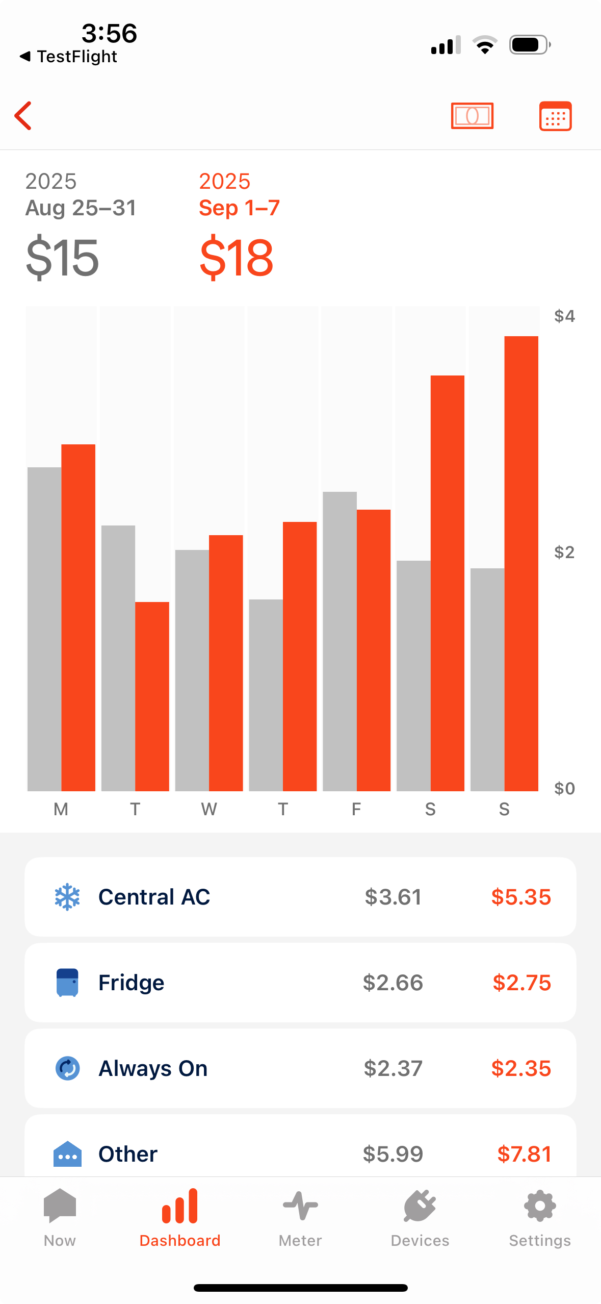 - The selected device moves to the top of the breakdown, and expands to show additional details about that device’s total usage in $ (if enabled)